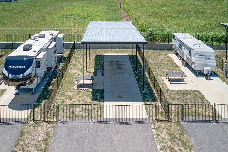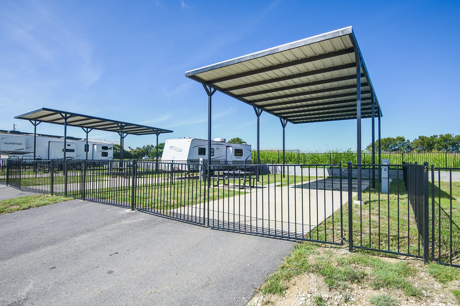 Steel Canopy Covered RV sites. These beautifully constructed canopies will keep you cool in the summer and dry in the winter. All fenced sites feature a 16’ gate and 4’ walk-through gate. Site features large concrete pad with concrete patio and dedicated internet at each site.